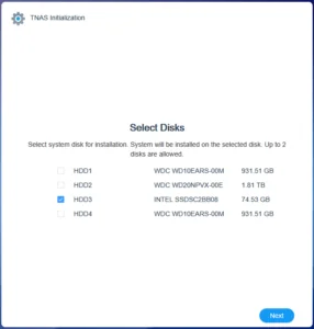 From there I opened the web interface on my PC. I received a drive compatibility warning and clicked through. I selected a small SATA SSD sitting in a drive bay rather than an NVMe drive for the OS install, clicked through the wipe confirmation, chose to download the latest software version, and waited a few minutes while the NAS rebooted.