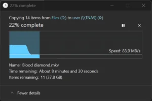 I copied a 4 GB file to the NAS over the 2.5G network connection and measured 282 MB/s. That is close to the theoretical ceiling of a 2.5 Gigabit link, which maxes out at around 312 MB/s. The test drives were slow mechanical HDDs and they kept up at that speed. On a larger transfer, speed dropped to around 90 MB/s after about a minute. This is consistent with the HDDs hitting their sustained sequential write limit. The network and the NAS controller were not the bottleneck. With NVMe drives or faster HDDs, you would saturate the 2.5G link cleanly.
