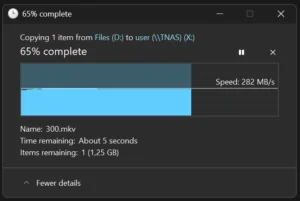 I copied a 4 GB file to the NAS over the 2.5G network connection and measured 282 MB/s. That is close to the theoretical ceiling of a 2.5 Gigabit link, which maxes out at around 312 MB/s. The test drives were slow mechanical HDDs and they kept up at that speed. On a larger transfer, speed dropped to around 90 MB/s after about a minute. This is consistent with the HDDs hitting their sustained sequential write limit. The network and the NAS controller were not the bottleneck. With NVMe drives or faster HDDs, you would saturate the 2.5G link cleanly.